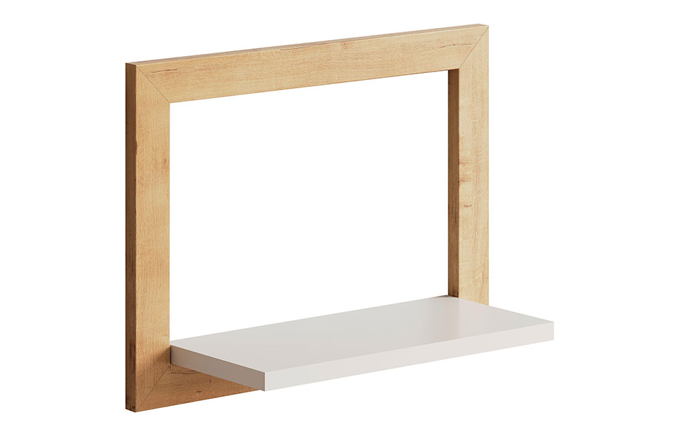 Основная часть изделия выполнена из ламинированной ДСП теплого оттенка «дуб бунратти», а рамочное обрамление изготовлено из МДФ-профиля. В комплекте идет скрытый крепеж — держатель, и навес. Допустимая нагрузка на древесно-стружечную плиту составляет 2 кг распределенного груза.